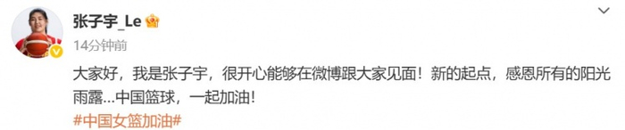 赛后,张子宇更新社媒写道:“大家好,我是张子宇,很开心能够在微博跟大家见面!新的起点,感恩所有的阳光雨露…中国篮球,一起加油!”