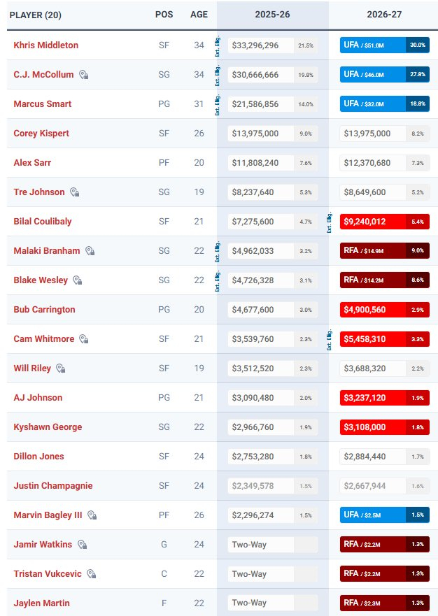 据报道,奇才队内薪资最高的三名球员:米德尔顿、CJ-麦科勒姆和斯玛特,均为到期合同。此外他们还有多个年轻球员的球队选项,部分年轻球员则会在明夏成为受限制自由球员,奇才可以根据他们的表现,灵活处理这些合同。