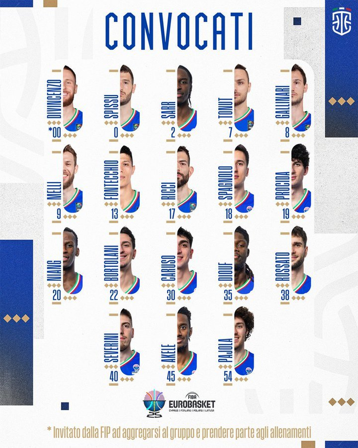 迪文岑佐正式入选意大利男篮 和加里纳利&丰泰基奥领衔欧锦赛名单