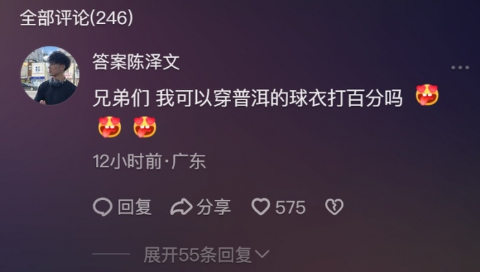 陈泽文本人则是在官宣视频中回复:“兄弟们,我可以穿普尔的球衣打百分吗😍😍😍?”