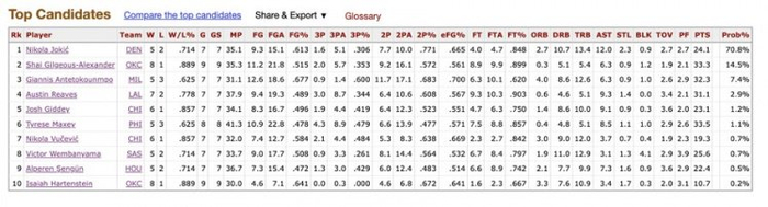 BBR最新MVP概率:约基奇70.8% SGA14.5% 东契奇因场次不够未上榜