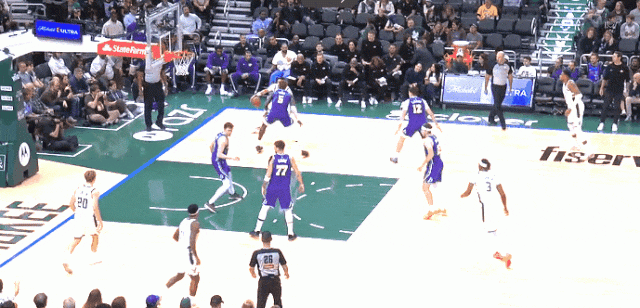 然后是今天下半场,卢卡指挥防守,发现雄鹿转移,立刻转身飞扑,盖掉了哈里斯的三分。