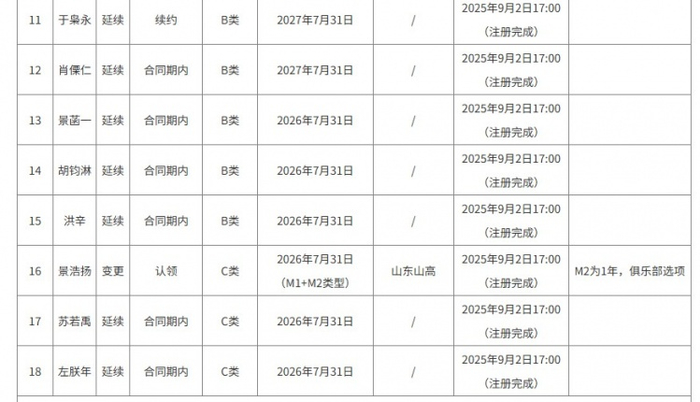 注:官方大名单中的李金效和李玮颢并不在此前更新的注册名单当中