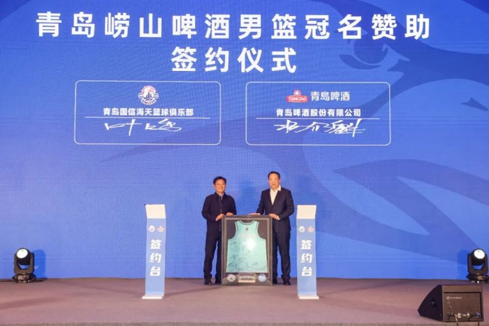 仪式上,青岛国信海天篮球俱乐部与青岛啤酒旗下品牌——崂山啤酒的冠名合作正式官宣,合作双方现场完成签约,青岛国信发展(集团)有限责任公司党委副书记邓友成向青岛啤酒股份有限公司营销总裁蔡志伟赠送球队签名球衣。本赛季,球队将以“青岛崂山啤酒男篮”的全新身份亮相CBA联赛,这不仅是商业上的强强联合,更是两个深植于青岛民心的品牌,在打造“篮球之城”“啤酒之都”城市名片的双向奔赴和在体育文化层面的共鸣与融合。