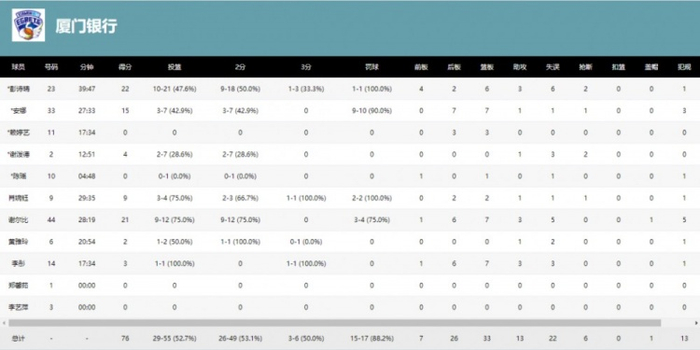 球队方面,厦门白鹭三项命中率皆比对手高;篮板端也终于改善,33-32还比对方多1个,但前场篮板7-17依然差距悬殊;全场多达22次的失误比对手直接多10次。球员方面,谢尔比打开使用开关全场砍下21分7篮板3助攻;安娜依然稳定输出拿到15分7篮板。另一位新援彭诗晴表现最为亮眼,拿到全队最高的22分,另有6篮板3助攻。肖婉钰和李彤等人依然拼劲儿十足。12月9日,厦门白鹭女篮将回到主场迎战福建金篮,希望队员们放下包袱,总结经验,保持住进攻稳定性,争取迎来赛季首胜。