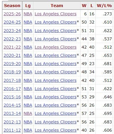 快船目前的战绩相当糟糕,这让他们连续14个赛季战绩为正(胜率过5成)的记录岌岌可危,常规赛还剩59场,他们要赢36场才能让这一记录延续下去。