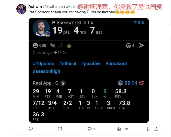超级残阵客胜骑士!勇蜜:斯潘塞拯救了勇士国度 库明加一无所有