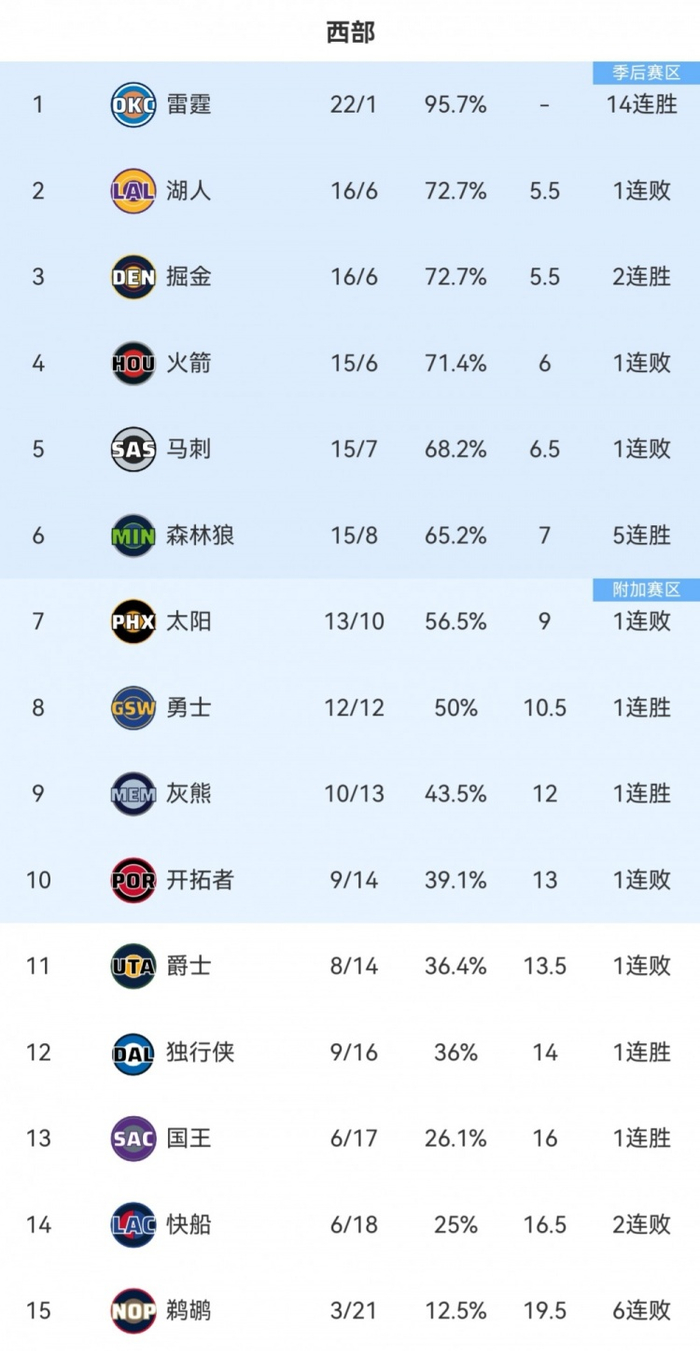 至此,湖人(16胜6负)以优于火箭(15胜6负)的战绩升至西部第二。