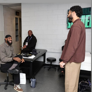 本场比赛,詹姆斯和塔图姆都因伤没有出战,不过他们进行了一场会面。