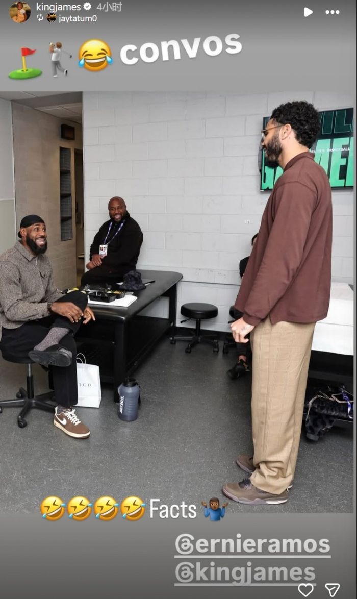 今天,詹姆斯在INS晒出了两人的照片,并写道:“高尔夫球讨论,🤣🤣🤣🤣事实。”
