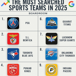 2025年搜索引擎搜索次数最多的10支运动队!雷霆&步行者分列8、9