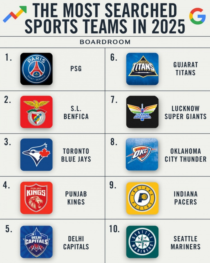 直播吧12月7日讯 根据Google搜索引擎数据显示,2025年被搜索最多的10支体育俱乐部。其中2025年打入总决赛的雷霆和步行者挤进了前十。
