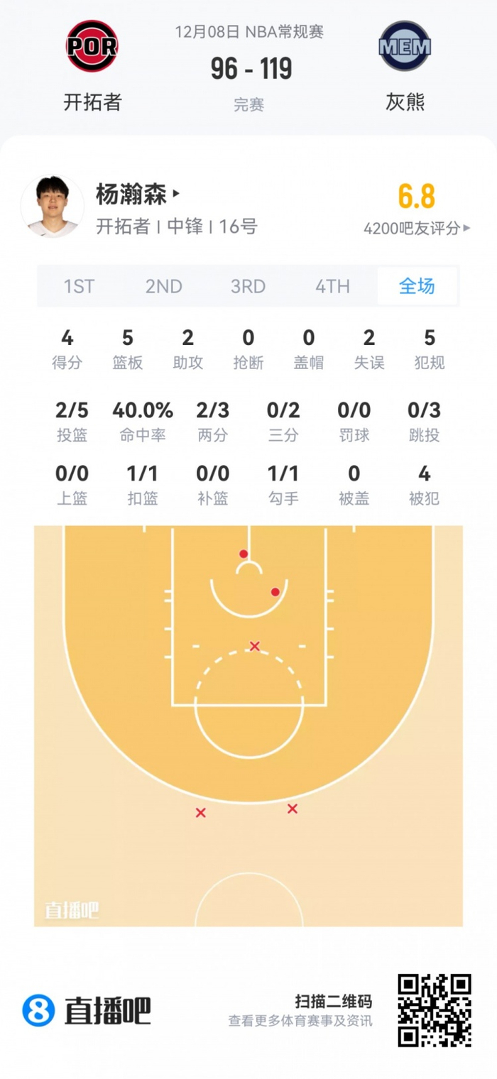 开拓者首轮16号秀杨瀚森 登场19.2分钟