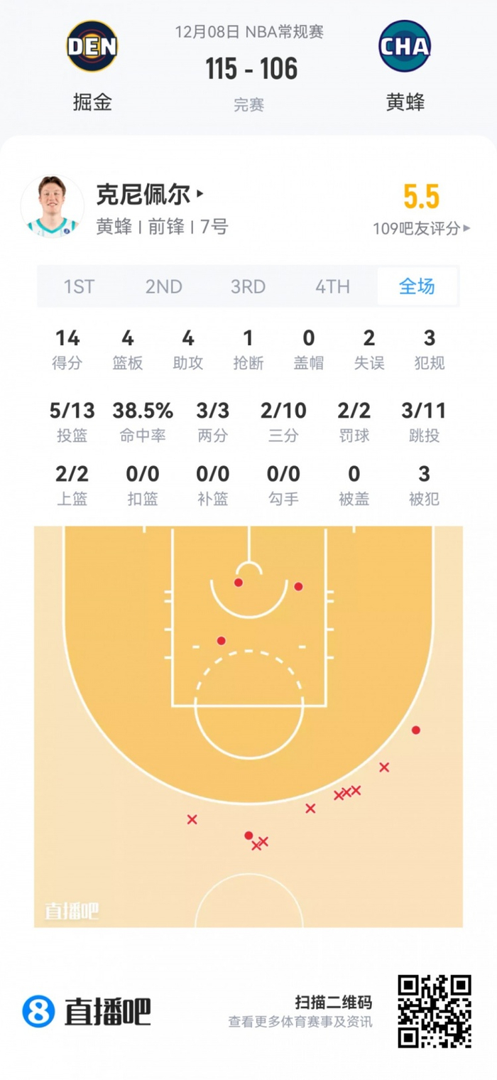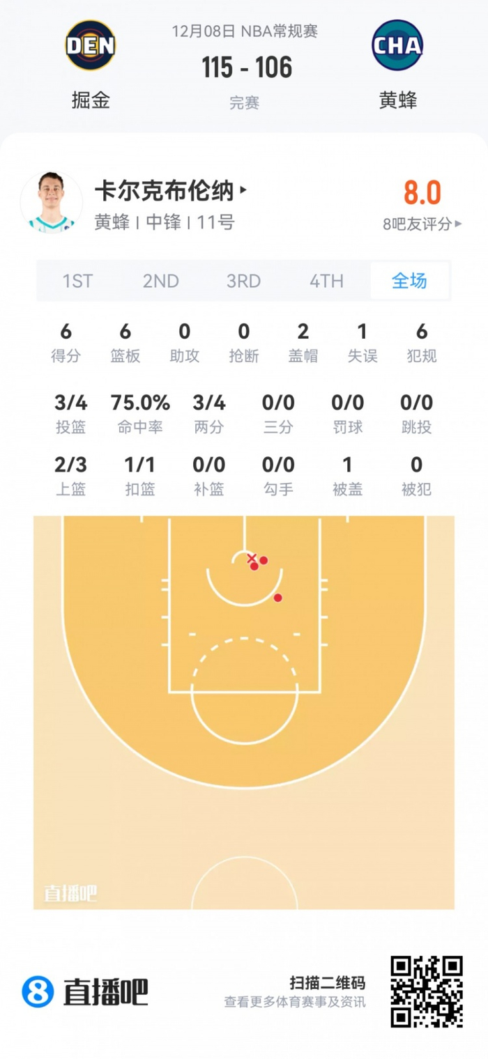 黄蜂次轮34号秀卡尔克布伦纳 登场24.5分钟