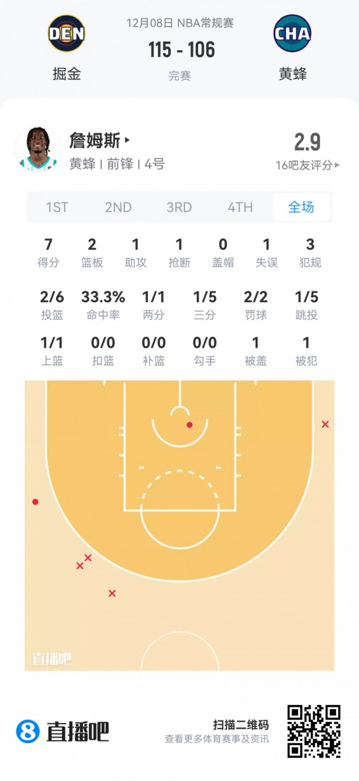黄蜂次轮33号秀赛恩·詹姆斯 登场25.9分钟