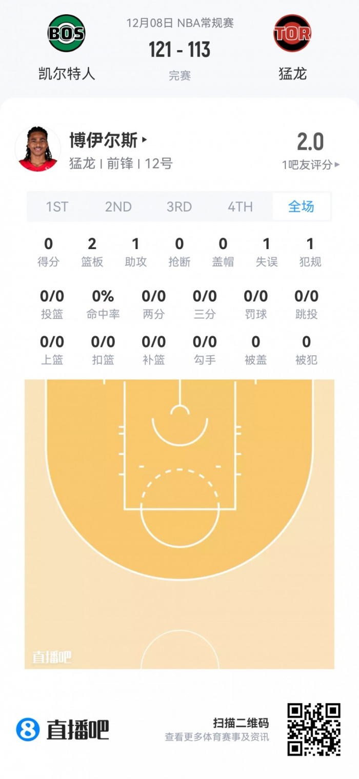 猛龙首轮9号秀博伊尔斯 登场6.2分钟