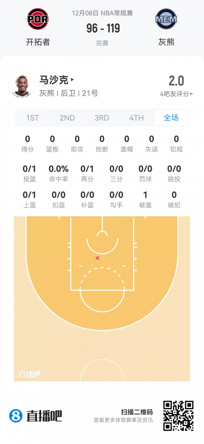 灰熊次轮59号秀贾麦·马沙克 登场3.1分钟