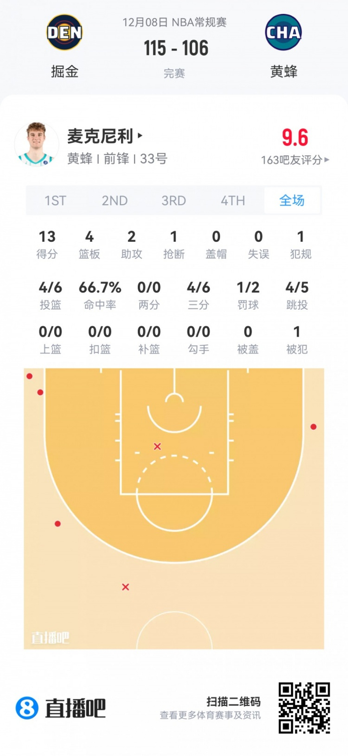 黄蜂首轮29号秀麦克尼利 登场19.5分钟