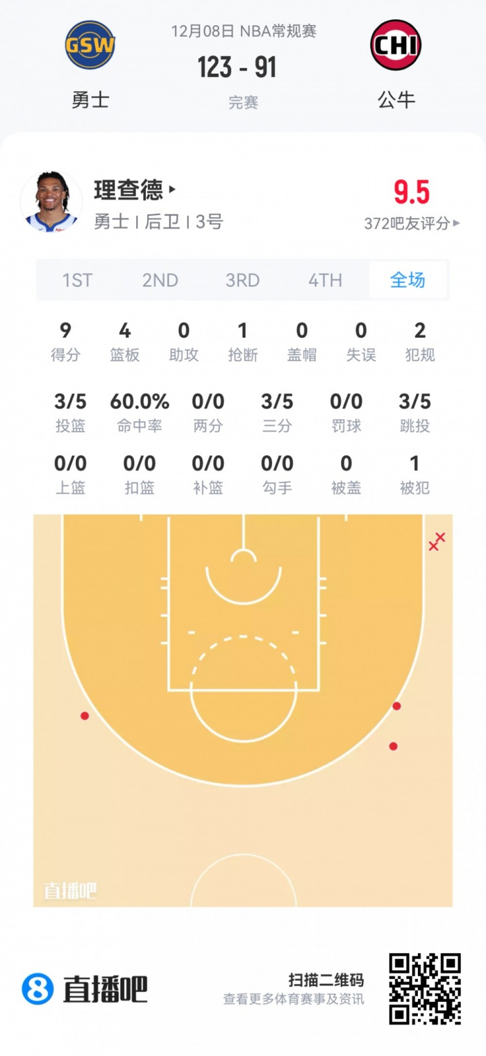 勇士次轮56号秀威尔·理查德 登场24.2分钟