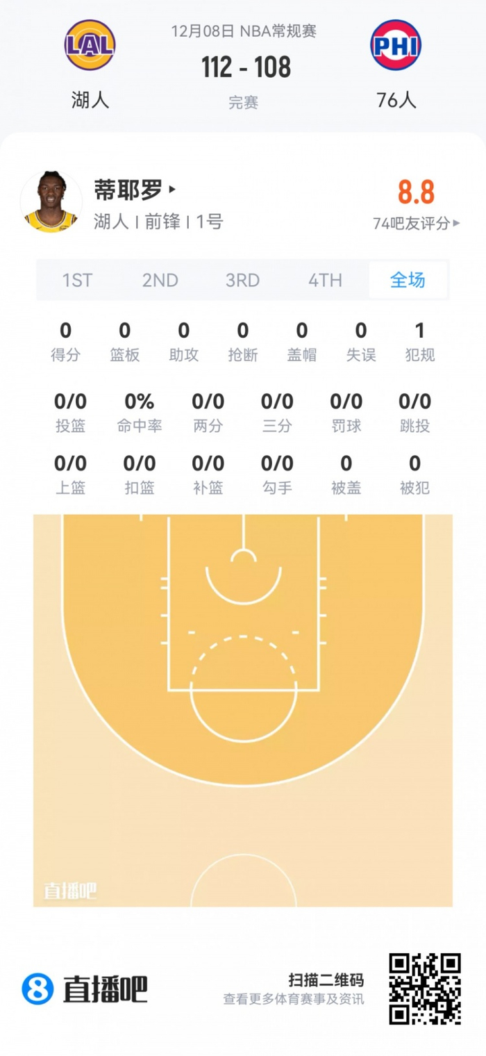 湖人次轮36号秀阿杜·蒂耶罗 登场4.4分钟