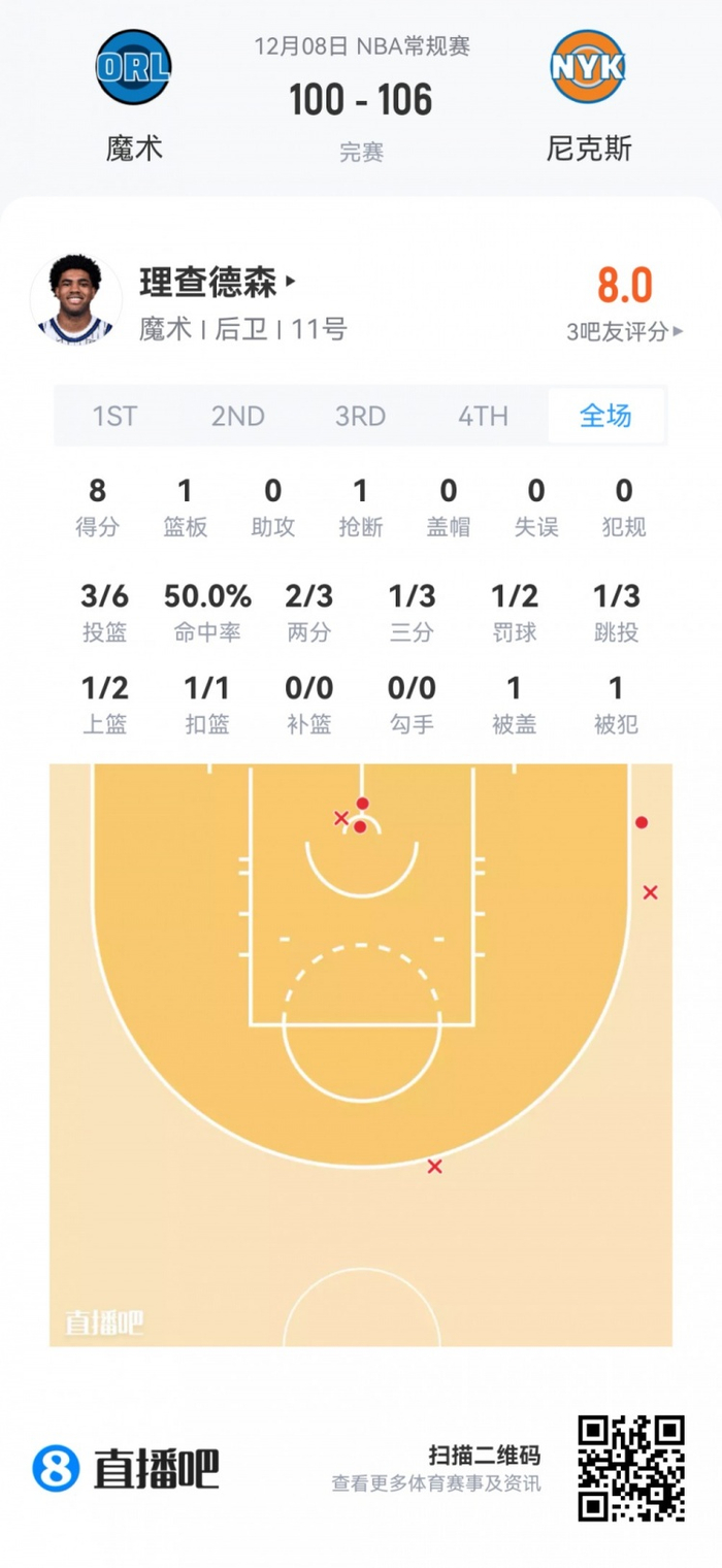 魔术首轮25号秀小理查德森 登场5.7分钟
