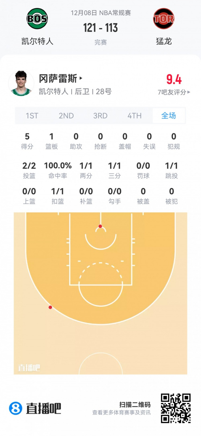 凯尔特人首轮28号秀冈萨雷斯 登场2.4分钟
