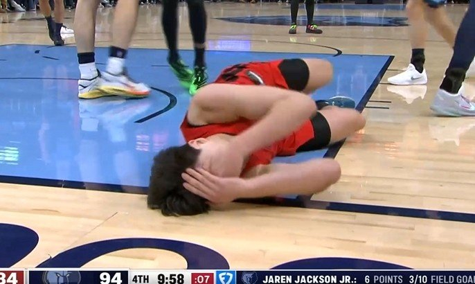 "倒地不起之后,裁判并没有吹停比赛。根据规则,在这种情况下比赛通常不会被叫停。我记得卡梅隆·安东尼曾经也有过类似的情况,他在一次比赛中脸部被击中后倒地,几乎整整一分钟的比赛时间内都躺在地上,期间双方进行了多次攻防转换。这时除非教练叫暂停,否则比赛一般不会因此中断。有时候裁判会吹停比赛,但如果球员没有妨碍到比赛进行,他们通常不会这么做。像这样的情况,比赛还是会继续进行,直到出现自然的停顿或者有人叫暂停。如果没有的话,裁判也没有义务必须吹停比赛。我并没有觉得裁判在操控比赛。