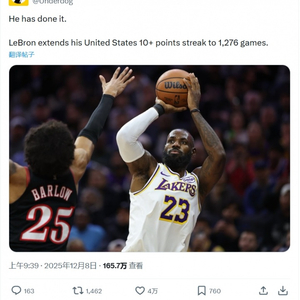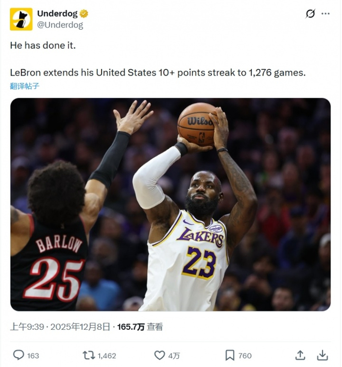 这也行美媒:詹姆斯在美国的得分上双纪录延续到1276场