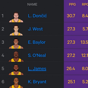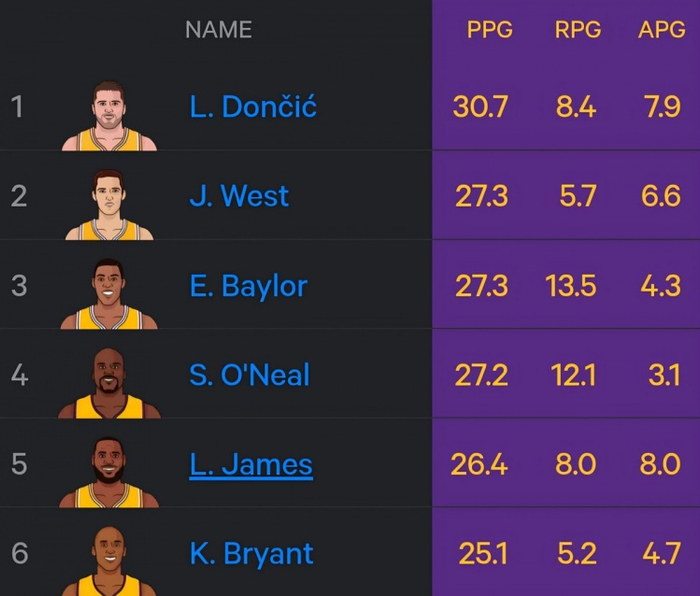 湖人生涯场均得分榜:东契奇30.7暂列第1 奥尼尔4 詹姆斯5 科比6