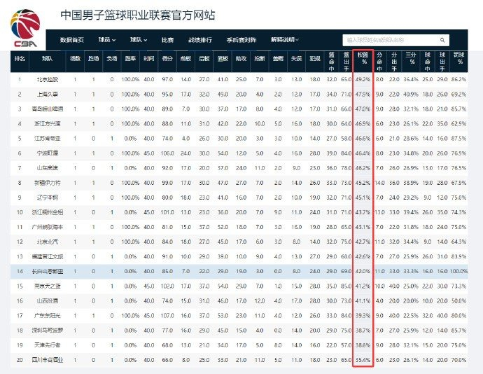 原文写道:“给大家看一下第一轮cba球队的投篮命中率哈,最高的北控队49.2%,最低的四川35.4%,没有一个球队投篮命中率能过5成。3分命中率最高的上海队40.9%,3分命中率最低的山西20%,就一支球队过了40%~~这还是双外,4节7人次的赛季。”