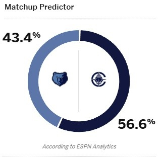 今天ESPN给出本场比赛的获胜概率预测,其中灰熊为43.4%,快船为56.6%。