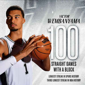 文班在第三节连续送出两记盖帽,成为历史上第三位至少连续100场有盖帽进账的球员,前两位是尤因(145场)和穆托姆博(116场)。