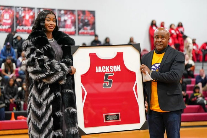 直播吧12月25日讯 底特律爱迪生公立学校(DEPSA)正式退役了WNBA洛杉矶火花球员里奇亚·杰克逊高中时穿着的5号球衣。