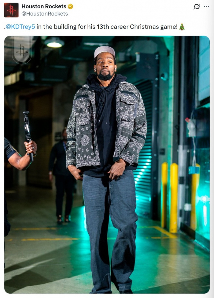 赛前,火箭官推晒出杜兰特气质照片,并写道:“凯文·杜兰特迎来个人第13次圣诞大战🎄!”