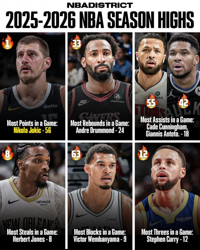 赛季各单项纪录!约老师56分 CC&字母18助 文班9帽 库里12记三分