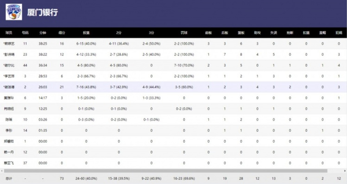 球队方面,厦门银行整体投篮命中率(40%)、两分命中率(39.5%)、三分命中率(40.9%)和罚球命中率(69.6%)均低于对手(分别为50.7%、53.8%、43.5%、82.4%);厦门银行篮板数28-43低于对手,前场篮板9-16也比对手少7个;助攻上,更是12-23比对手少11个;还有厦门银行出现13次失误,其中9次失误是对手抢断。球员方面,外援谢泼德扛起球队进攻拿到最高的21分,外援谢尔比也有15分入账;国内球员赖婷艺拿到16分6篮板3助攻,彭诗晴也有12分8篮板4助攻。12月30日,厦门银行女篮将继续主场对阵河南豫光金铅,希望球队及时调整,取长补短,二番战争取复仇。