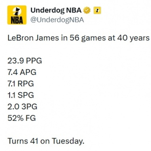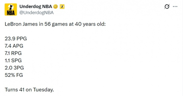 这可是40岁啊!詹姆斯40岁数据:场均23.9分7.1板7.4助 命中率52% NBA综合 2025.12.2913:09 关注 詹姆斯40岁数据:场均23.9分7.1板7.4助1.1抢断,场均2记三分,投篮命中率52%【来源:直播吧】