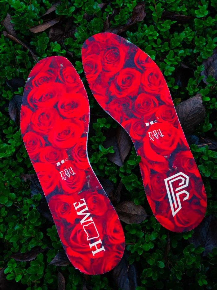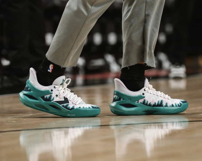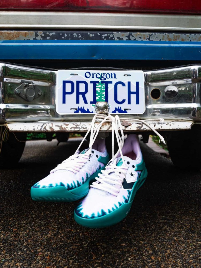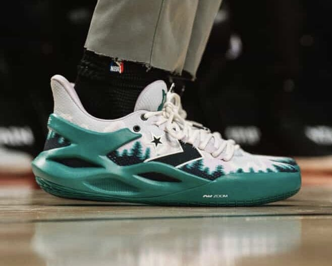 这双Converse BB Trilliant PE设计灵感来源于他的家乡俄勒冈州。俄勒冈州有“玫瑰之州”的昵称,州花就是玫瑰,呼应鞋垫元素,同时右脚鞋垫上还有他的个人Logo。而常绿针叶林,是俄勒冈州的代表性树种之一,也呼应鞋面的树纹图案。