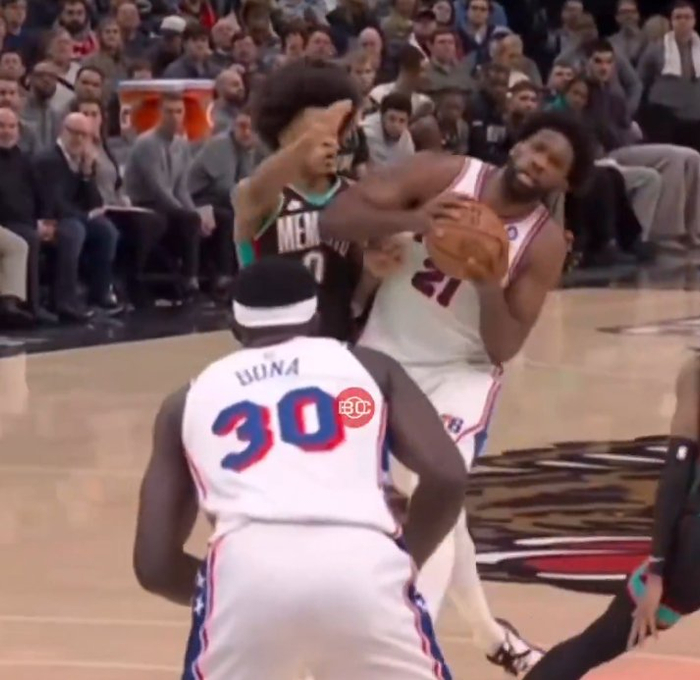 面对小前锋韦尔斯一碰就倒!美媒打趣:恩比德一肘一倒哨子就来了