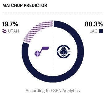 卡位战!ESPN明日胜率预测:快船为80.3% 爵士仅有19.7%