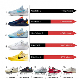 直播吧1月2日讯 球鞋媒体kixstats统计了12月份NBA球员上脚球鞋的总时长排行,其中科比的两款球鞋排名前二,Kobe 6依旧是断档第一。WNBA球星约内斯库的Sabrina 3排名第三。