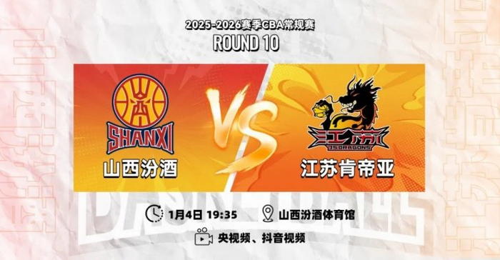 1月4日19:35,2025-26赛季CBA常规赛第十轮,江苏肯帝亚将远赴山西,开启两连客之旅,客场对阵山西汾酒。