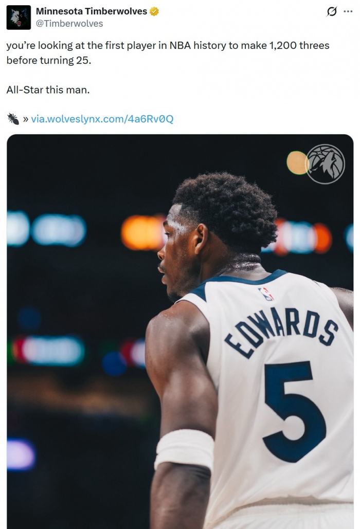 值得一提的是,森林狼官方统计爱德华兹成为NBA历史首位在25岁前投进1200+三分的球员,还为爱德华兹拉票全明星,实际上是官推算错了。