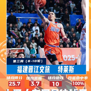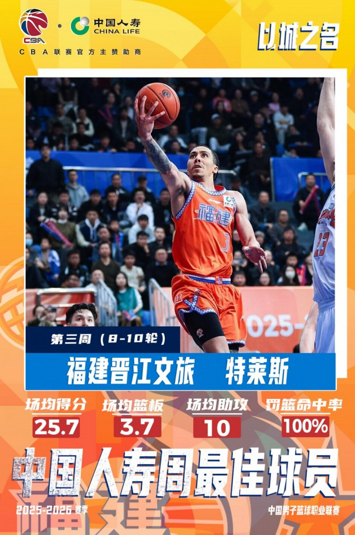 【特莱斯当选2025-2026赛季CBA联赛常规赛第三周中国人寿周最佳球员】福建浔兴SBS男篮球员特莱斯本周出战3场,率队取得2胜1负的战绩,他场均出场30分钟的时间里可以得到25.7分、3.7篮板、10助攻、1.7抢断,罚篮命中率100%(23罚全中)。在主场与新疆伊力特的比赛中,特莱斯全场出战36分钟,砍下41分并送出12次助攻,成为本赛季首位单场得到40+得分和10+助攻的球员。