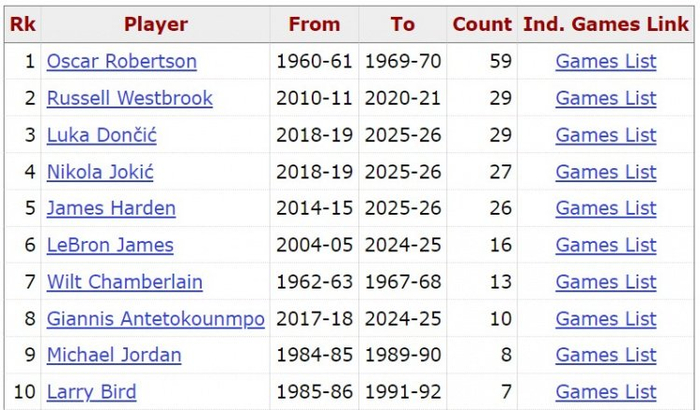 东契奇生涯至今30次砍下35+三双 现役第一历史第2 仅次于大O