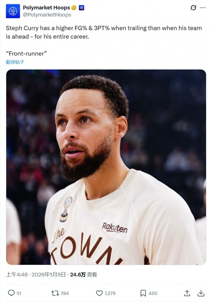 数据网站:库里整个生涯落后时的命中率&三分命中率均大于领先时