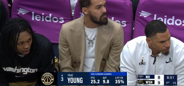已经到了!特雷·杨替补席观战新东家奇才与鹈鹕比赛