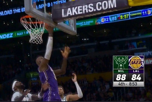 奋力追击!詹姆斯里突外投连得5分 帮助湖人迫近比分打停雄鹿