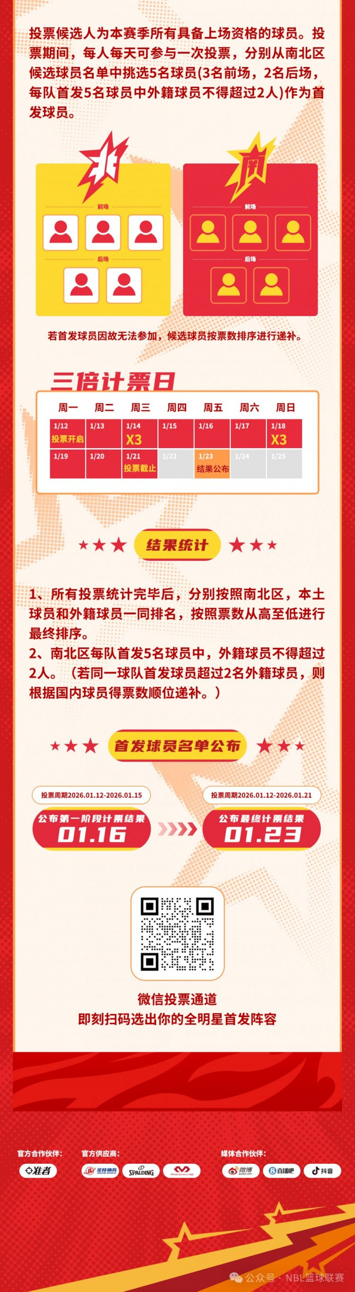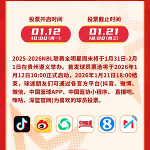 2025-2026 NBL联赛全明星周末即将于1月31日-2月1日在贵州遵义举办。首发阵容投票已于今日10:00正式开启!请查收这份票选规则,扫描图片底部二维码参与投票,助力你喜欢的球员前往遵义!