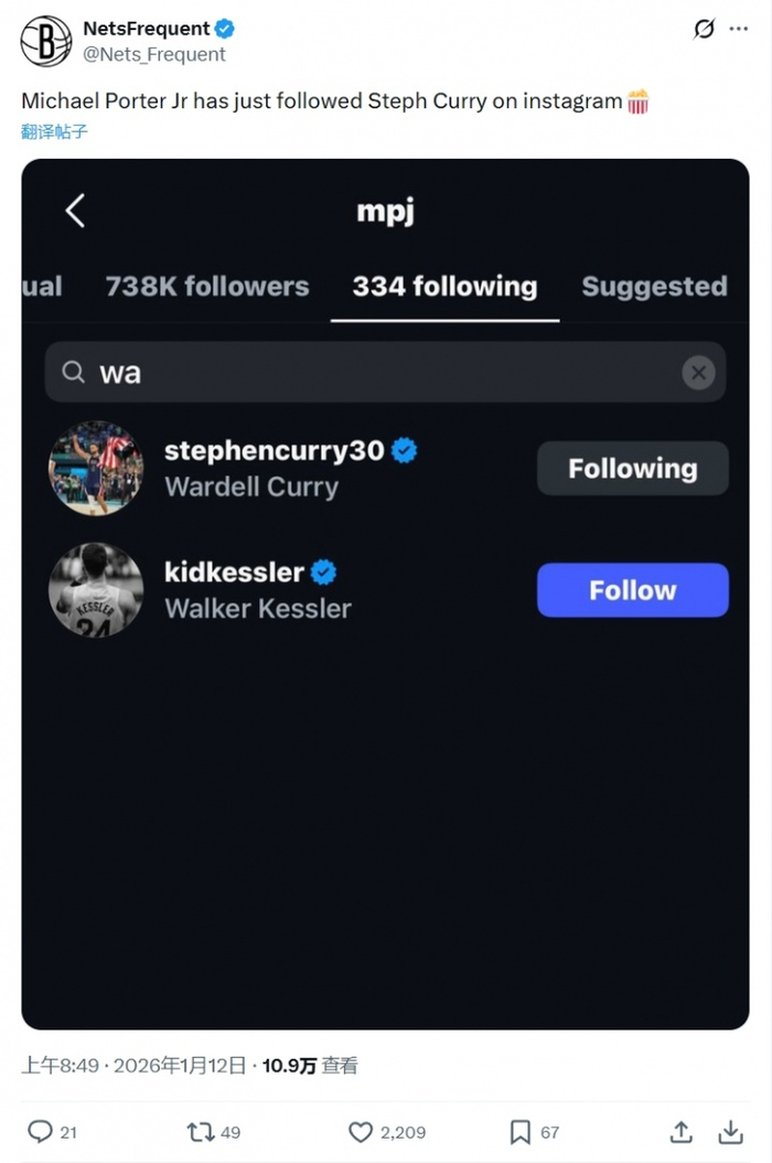 大的要来了?篮网自媒体:小波特社媒刚刚关注了库里👀
